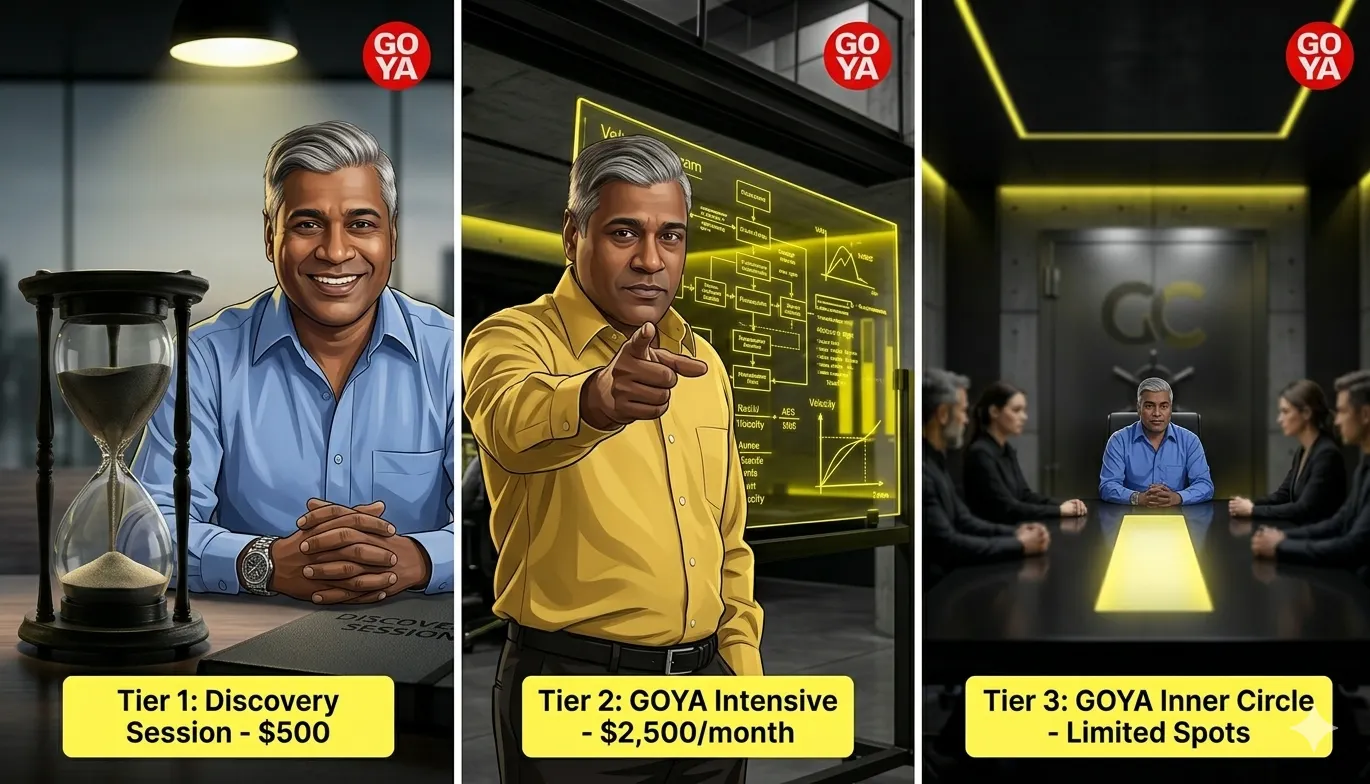 A one-time deep dive to identify exactly where you're stuck, and whether or not you're coachable enough to be a GOYA Client. This is the main gate. Not everyone gets in.